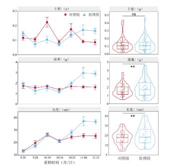 石墨烯光催化網(wǎng)的作用下,雖然苦草干重在處理組與對照組之間差異不顯著(P >0.05),但處理組苦草濕重和株長均顯著增加(P<0.01;圖2)。相比于對照組,試驗期間處理組苦草濕重和株長分別增加了20%和15%,并且苦草濕重、株長,甚至干重在試驗開始1個月后,增長幅度更加明顯(圖2)。在石墨烯光催化功能材料的作用下,水體中溶解氧持續(xù)上升,TP有機污染物和葉綠素a濃度顯著下降,水體透明度和水環(huán)境質(zhì)量得到明顯改善。7Iy新型光催化網(wǎng)_水庫治理_河道治理_水生態(tài)修復(fù)_水環(huán)境治理與修復(fù)_江蘇雙良環(huán)境科技有限公司