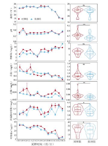 石墨烯光催化網(wǎng)對水質(zhì)的影響如圖1所示。處理組和對照組的水溫、溶解氧及總氮濃度差異不顯著,但處理組的pH(均值是8.69)顯著低于對照組(均值是8.77)(P< 0.001),表明石墨烯光催化網(wǎng)的使用可降低水體中的pH。這可能由于在光照的條件下,加速了空穴和電子與吸附在TiO2表面的OH-和O2的反應(yīng),使得水體中OH-大量消耗,導(dǎo)致pH降低。試驗期間溶解氧整體呈上升趨勢,一個月后達(dá)到最高點。7Iy新型光催化網(wǎng)_水庫治理_河道治理_水生態(tài)修復(fù)_水環(huán)境治理與修復(fù)_江蘇雙良環(huán)境科技有限公司