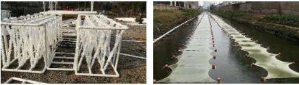 探索過程也并非是一帆風(fēng)順,經(jīng)歷了兩次失敗后,在第三次的方案調(diào)整中,他果斷摒棄了之前不銹鋼板固定PVC框的方式,首次采用了不銹鋼橡膠皮抱箍,將植物模塊放置在浮框中心,使得不銹鋼框架在水下“隱身”,在河道中2周左右能夠讓網(wǎng)穩(wěn)定在水下15cm左右的位置。新型布網(wǎng)方式的應(yīng)用,取消了原有浮球、配重的使用,這不僅有效降低了配件的使用成本,更使得敷網(wǎng)更加簡易化,減少了人工施工難度,大幅度提高了現(xiàn)場工作效率。