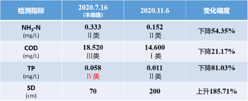 治理前本底值檢測為Ⅳ類水,透明度僅為70cm;11月6日取樣水質(zhì)與本底值對比,數(shù)據(jù)顯著改善。(氨氮由原來的0.333下降至0.152,下降54.35%;化學(xué)需氧量由原來的18.52下降至14.6,下降21.17%;總磷由原來的0.058下降至0.011,下降81.03%;透明度從原來的70cm提升至200cm,上升185.71%。)NyY新型光催化網(wǎng)_水庫治理_河道治理_水生態(tài)修復(fù)_水環(huán)境治理與修復(fù)_江蘇雙良環(huán)境科技有限公司