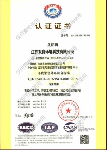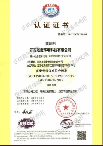 經(jīng)專業(yè)認(rèn)證機(jī)構(gòu)嚴(yán)格審核,2022年6月,江蘇雙良環(huán)境科技有限公司成功獲得ISO9001:2015 質(zhì)量管理、ISO14001:2015 環(huán)境管理、 ISO45001:2018 職業(yè)健康安全管理三大體系認(rèn)證。認(rèn)證范圍覆蓋市政公用工程、環(huán)保工程的施工。