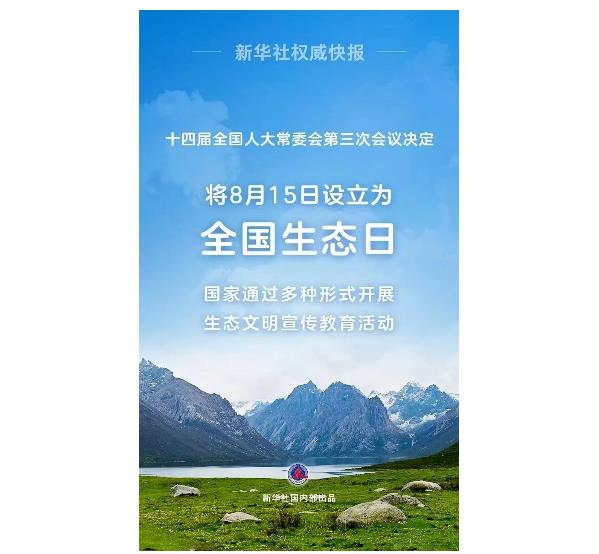 6月28日,十四屆全國人大常委會第三次會議決定:將8月15日設立為全國生態(tài)日。國家通過多種形式開展生態(tài)文明宣傳教育活動。習近平同志在浙江工作期間,2005年8月15日考察湖州市安吉縣,首次提出“綠水青山就是金山銀山”科學論斷。這一論斷是習近平生態(tài)文明思想的核心理念。將8月15日設立為全國生態(tài)日,比較符合確定紀念日、活動日時間的基本原則,能夠充分體現(xiàn)首創(chuàng)性、標志性、獨特性。設立全國生態(tài)日,有利于更好學習宣傳貫徹習近平生態(tài)文明思想,提高全社會生態(tài)文明意識,增強全民生態(tài)環(huán)境保護的思想自覺和行動自覺,以釘釘子精神推動生態(tài)文明建設不斷取得新成效。