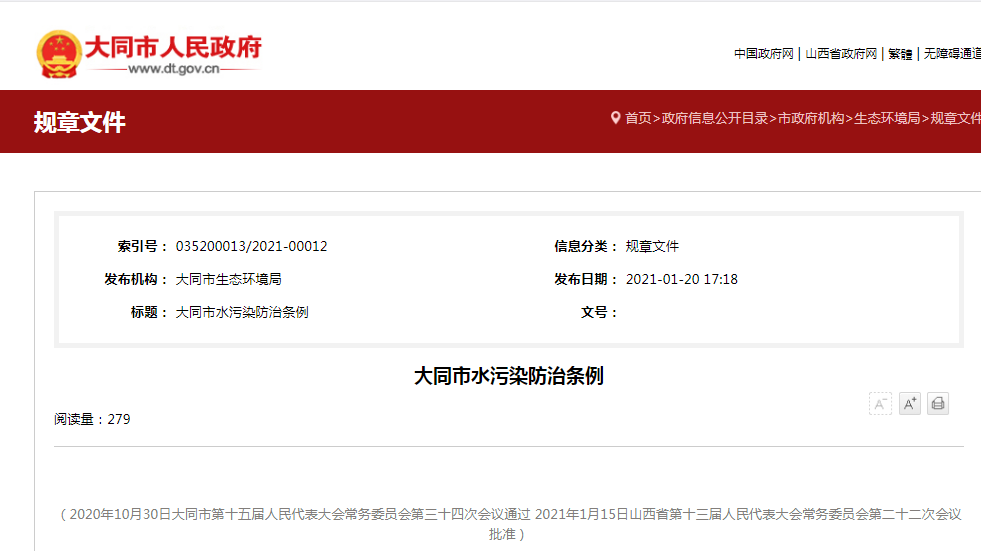 大同市第十五屆人民代表大會常務委員會第三十四次會議于2020年10月30日通過,山西省第十三屆人民代表大會常務委員會第二十二次會議于2021年1月15日批準,自2021年5月1日起施行。RDQ新型光催化網(wǎng)_水庫治理_河道治理_水生態(tài)修復_水環(huán)境治理與修復_江蘇雙良環(huán)境科技有限公司
