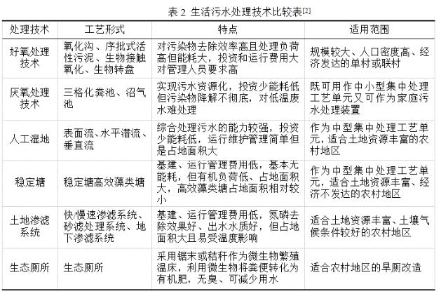 農(nóng)村生活污水末端治理工藝可分為生物處理技術(shù)和生態(tài)處理技術(shù)兩大類。生物處理技術(shù)主要包括好氧生物處理和厭氧生物處理兩大類;生態(tài)處理技術(shù)主要包括人工濕地、穩(wěn)定塘、土地滲濾系統(tǒng)。生態(tài)廁所是基于過程控制應(yīng)用的技術(shù),其對(duì)黑水的后續(xù)處理起關(guān)鍵作用。生活污水處理技術(shù)具體的特點(diǎn)和適用范圍見表2。
