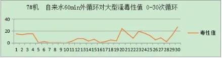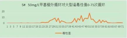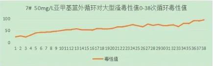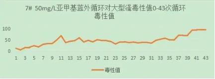 50mg/L亞甲基藍溶液外循環(huán),水槽中是否加入光催化網(wǎng)進行對照試驗,60min/循環(huán),收集排水再循環(huán),4L。實驗運行43次循環(huán)。從大型溞毒性值與循環(huán)數(shù)的關(guān)系上,可以看出50mg/L亞甲基藍溶液對大型溞有較小影響。FNZ新型光催化網(wǎng)_水庫治理_河道治理_水生態(tài)修復(fù)_水環(huán)境治理與修復(fù)_江蘇雙良環(huán)境科技有限公司