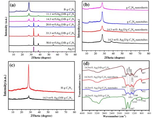 圖1.(a)不同質(zhì)量比的B-g-C3N4,Ag2O和Ag2O / B-g- C3N4復(fù)合材料的X射線衍射圖;(b)g- C3N4納米片,g- C3N4納米管,14.3 wt%的Ag2O/ g- C3N4納米片和14.3 wt%的Ag2O/ g- C3N4納米管;(c)H-g- C3N4和14.3重量%的Ag2O / H-g- C3N4;(d)14.3重量%的Ag 2 O / B-g- C3N4,Ag2O/ g- C3N4納米片,Ag2O/ g- C3N4納米管和Ag2O / H-g- C3N4的FTIR光譜。vx4新型光催化網(wǎng)_水庫治理_河道治理_水生態(tài)修復(fù)_水環(huán)境治理與修復(fù)_江蘇雙良環(huán)境科技有限公司