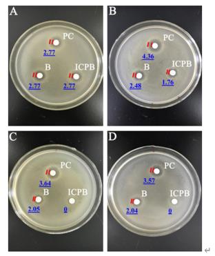 r1K新型光催化網(wǎng)_水庫(kù)治理_河道治理_水生態(tài)修復(fù)_水環(huán)境治理與修復(fù)_江蘇雙良環(huán)境科技有限公司圖2 20mg/LTCH在0h(A)、1h(B)、4h(C)和8h(D),采用PC(可見(jiàn)光光催化)、B(生物降解)和ICPB(光催化-生物降解耦合)對(duì)金黃色葡萄球菌的抑制作用。B組為附著生物膜的載體在黑暗環(huán)境下單獨(dú)進(jìn)行生物降解;PC組為可見(jiàn)光光催化(無(wú)生物膜培養(yǎng));ICPB組為可見(jiàn)光光催化與生物降解耦合。數(shù)字表示抑制區(qū)的半徑減去濾紙的半徑。