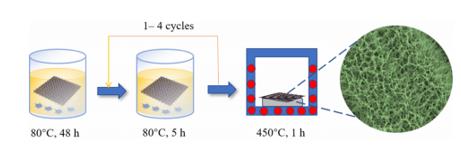 2納米線由于具有高比表面積和增加的電荷分離能力從而表現(xiàn)出優(yōu)異的光活性;然而對(duì)目標(biāo)污染物的有限吸附能力阻礙了光催化降解水中污染物。我們?cè)诖私榻B一種溫和的方法,在碳布上沉淀可調(diào)厚度為1.5–4.5μm的銳鈦礦型TiO2納米線陣列,從而同時(shí)獲得高吸附容量和優(yōu)異的光活性。與沉積在金屬Ti基底上的TiO