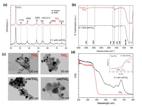圖二 (a) TiO2和0.1 wt% chl/TiO2的XRD圖譜,(b) TiO2和0.1 wt% chl/TiO2的FTIR光譜,(c) TiO2和0.1 wt% chl/TiO2的TEM圖像,(d) TiO2和0.1 wt% chl/TiO2的Tauc圖確定帶隙
