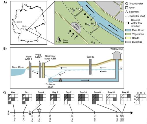 圖1 研究地點和實驗時間的概述。A) 研究地點的地理位置、取樣地點的位置和地點特征。一般水流方向用箭頭表示,實線和虛線分別表示有無河岸過濾條件下的水流方向。B) 研究場地的橫截面示意圖(未按比例繪制)。河岸過濾期間的地下水位和水流方向用虛線表示,如A所示)。C) 實驗的時間軸和每個地點和時間點獲得的樣本的表格概述。河岸過濾的開始用一顆星星標出。灰色填充樣本表顯示了給定地點和時間點的樣本可用性。樣帶A、B和C列為行,(G:地下水;R:河流;S:沉積物)樣本類型為柱狀。