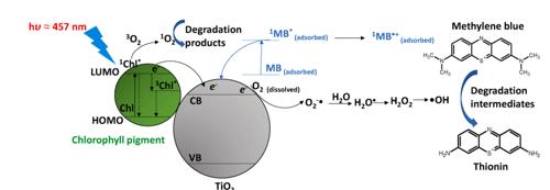 圖一 在可見光照射條件下葉綠素增感TiO2光催化降解亞甲基藍的機理圖