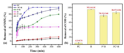 3JQ新型光催化網(wǎng)_水庫(kù)治理_河道治理_水生態(tài)修復(fù)_水環(huán)境治理與修復(fù)_江蘇雙良環(huán)境科技有限公司圖3 采用不同的處理方法(a)SMX和(b)COD的去除去除效果。P:僅LED光的光解;P+AD:LED的光解和原始載體的吸附,B:生物載體的生物降解,P+B:LED燈的光解和生物降解;PC:僅光催化,PC+B:光催化和生物降解。數(shù)值表示為平均值±標(biāo)準(zhǔn)偏差(SD)。