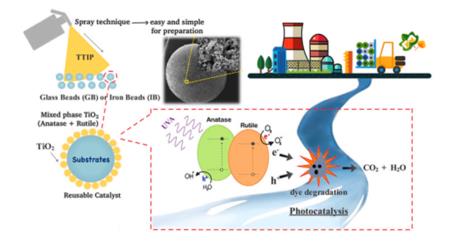 2)因其成本低、用途廣而被廣泛用作催化劑。然而,使用二氧化鈦粉末會導致很難從處理過的廢水中分離。因此,本課題研究了二氧化鈦在玻璃和鐵珠等兩種不同基質上的固定化。采用噴霧液相法制備復合材料分散到基材上,然后材料在不同的溫度(600-750?C)煅燒。在700?C煅燒溫度下,SEM和EDS分析表明,TiO