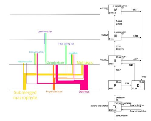 iyw新型光催化網(wǎng)_水庫治理_河道治理_水生態(tài)修復(fù)_水環(huán)境治理與修復(fù)_江蘇雙良環(huán)境科技有限公司 圖5:經(jīng)濟(jì)大同湖食物網(wǎng)的流程圖(左)和林德曼脊椎(右)。不同的顏色對(duì)應(yīng)不同的官能團(tuán),每條線段的粗細(xì)表示相對(duì)能量流,字體大小表示相對(duì)生物量。P:生產(chǎn)者;D:碎屑;TL:營(yíng)養(yǎng)級(jí);TST (%):系統(tǒng)總吞吐量(%);TE:轉(zhuǎn)移效率。