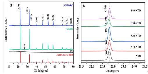 3/生物炭(S-NTO/BC)的X射線衍射光譜(XRD)。(b)含有不同量S離子的S-NTO樣品的X射線衍射圖(XRD)。S/Ta摻雜比為10、20、30和40 mol%的樣品分別標(biāo)記為S10-NTO、S20-NTO、S30-NTO和S40-NTO。
