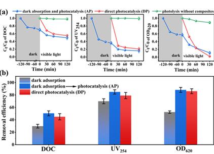cTa新型光催化網(wǎng)_水庫(kù)治理_河道治理_水生態(tài)修復(fù)_水環(huán)境治理與修復(fù)_江蘇雙良環(huán)境科技有限公司(a) IOM在黑暗中的吸附和可見(jiàn)光下UV254和OD620光催化對(duì)DOC去除。黑線表示暗吸收和光催化(AP)。紅線表示直接光催化(DP),藍(lán)線表示不含復(fù)合物的光解結(jié)果已添加。(b)處理結(jié)束時(shí)的總體去除效率。(對(duì)于本圖例中的顏色參考,讀者可參考本文的web版本。)光催化是一種高效的高級(jí)氧化工藝,為控制湖泊或水庫(kù)中的藻華污染治理提供了一種很有前景的替代方法。以往的研究主要集中在光催化作用破壞藻類細(xì)胞上,而忽略了分泌物的釋放特別是細(xì)胞內(nèi)的有機(jī)物(IOM)。在此,通過(guò)固定相預(yù)光催化與新型Bi
