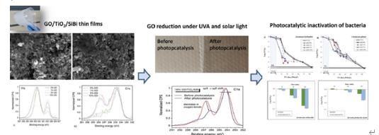 2/聚硅氧烷(SiBi)薄膜。通過掃描電子顯微鏡(SEM)、透射電子顯微鏡(TEM)、X射線光電子能譜(XPS)、紫外光電子能譜(UPS)、拉曼光譜和水接觸角測量對制備的涂層進行了表征。在光催化試驗中,觀察到用GO改性的所制備的涂層的顏色發(fā)生了強烈的變化。光催化試驗后薄膜的XPS分析表明GO發(fā)生了還原。研究了制備的涂層在UVA和自然陽光照射下對水產(chǎn)養(yǎng)殖水中自然產(chǎn)生的微生物的滅活作用。在UVA照射下,研究了所制備涂層中rGO濃度對靶菌嗜水氣單胞菌和吉列檸檬酸桿菌滅活的影響。與吉列檸檬酸桿菌相比,嗜水氣單胞菌對光催化滅活更敏感。rGO濃度為1%和5%的薄膜對目標(biāo)微生物有較高的光催化滅活作用。進一步測試了rGO/TiO
