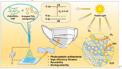 9Zm新型光催化網(wǎng)_水庫治理_河道治理_水生態(tài)修復(fù)_水環(huán)境治理與修復(fù)_江蘇雙良環(huán)境科技有限公司在災(zāi)難性的SARS-CoV-2(2019冠狀病毒疾?。┐罅餍衅陂g,美國疾病控制和預(yù)防中心強烈建議使用個人防護裝備(PPE)進行自我保護。然而,個人防護用品的大規(guī)模使用在回收和消毒使用過的口罩方面遇到了重大挑戰(zhàn)。為了解決舊口罩的相關(guān)塑料污染問題,在這項工作中,我們設(shè)計了一種可重復(fù)使用、可生物降解和抗菌的口罩。通過聚乙烯醇(PVA)、聚環(huán)氧乙烷(PEO)和纖維素納米纖維(CNF)的靜電紡絲,然后酯化和沉積氮摻雜的TiO