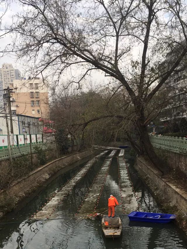 2017年12月21日,內(nèi)秦淮河中段,施工人員在實(shí)施石墨烯光催化網(wǎng)的鋪設(shè)。2gk新型光催化網(wǎng)_水庫治理_河道治理_水生態(tài)修復(fù)_水環(huán)境治理與修復(fù)_江蘇雙良環(huán)境科技有限公司